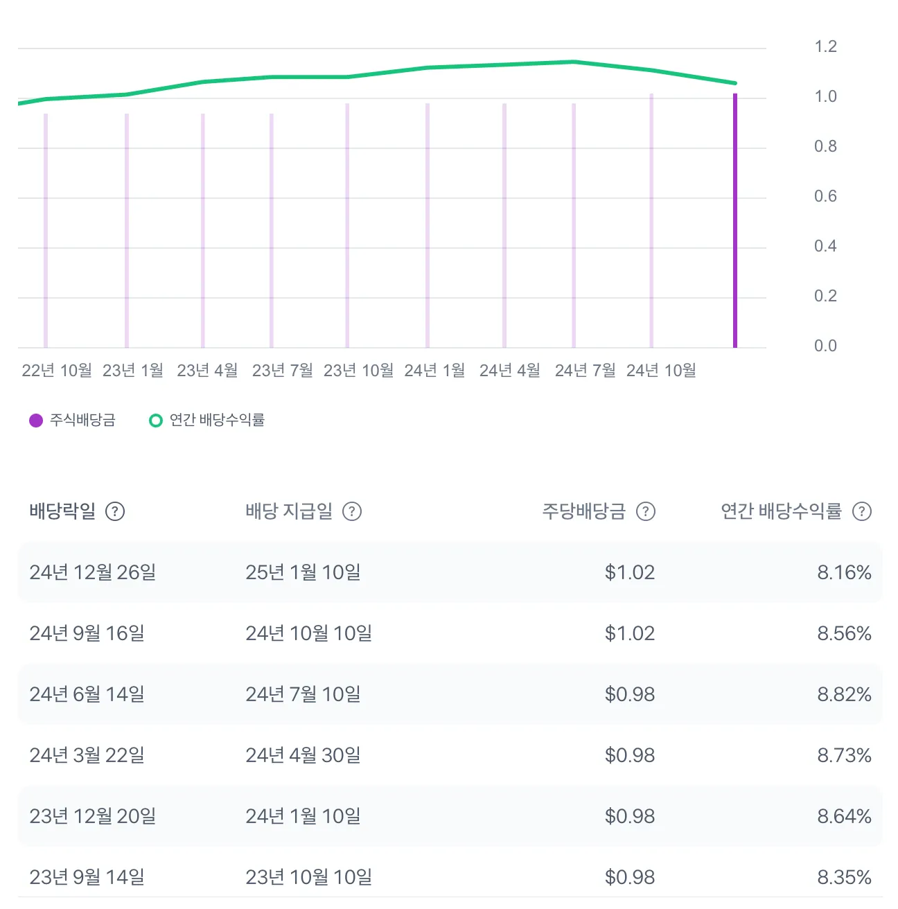 알트리아는 2024년 기준 주당 $1.02의 분기 배당금을 지급하며, 연간 배당 수익률은 8.1%에 달합니다. 이는 다른 배당주와 비교했을 때도 상당히 높은 수준이며, 지속 가능한 현금흐름을 통해 배당 정책이 안정적으로 유지되고 있습니다.