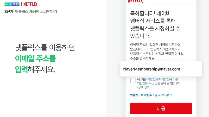 멤버십MY페이지 > 콘텐츠+탭에서 멤버십으로 넷플릭스 혜택을 선택한 후, 계정 연동 단계를 따라가면 기존의 자체 구독 중인 이용권을 네이버플러스 멤버십으로 통합하는 단계를 밟게 됩니다.