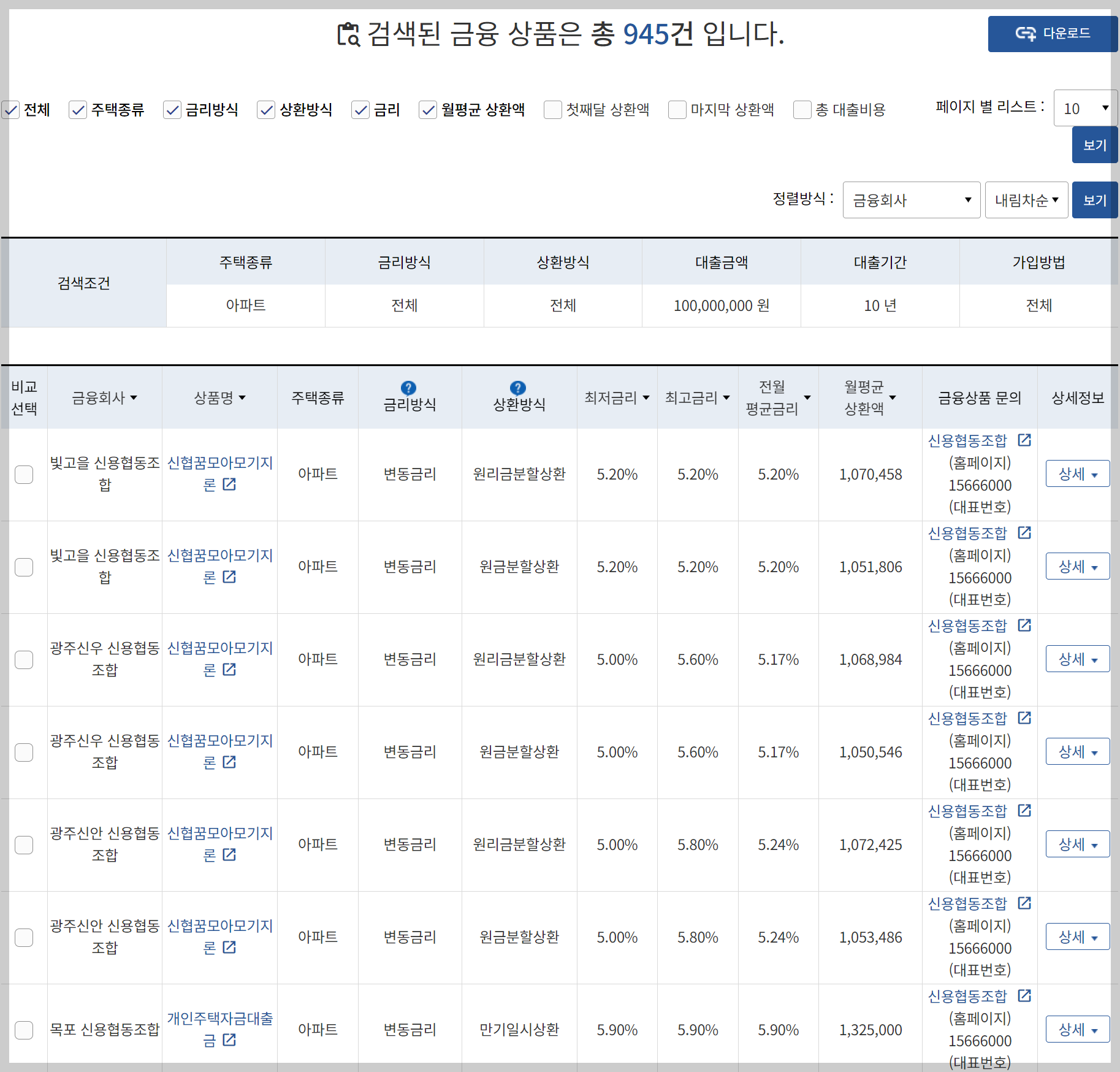 금융감독원 홈페이지를 접속하면 위와 같은 서비스를 이용할 수 있습니다. 주택담보대출, 전세자금대출, 개인신용대출 등 메뉴를 선택하고 금액과 대출기간 금리방식, 상환방식, 지역 등을 선택해서 조회할 수 있습니다.