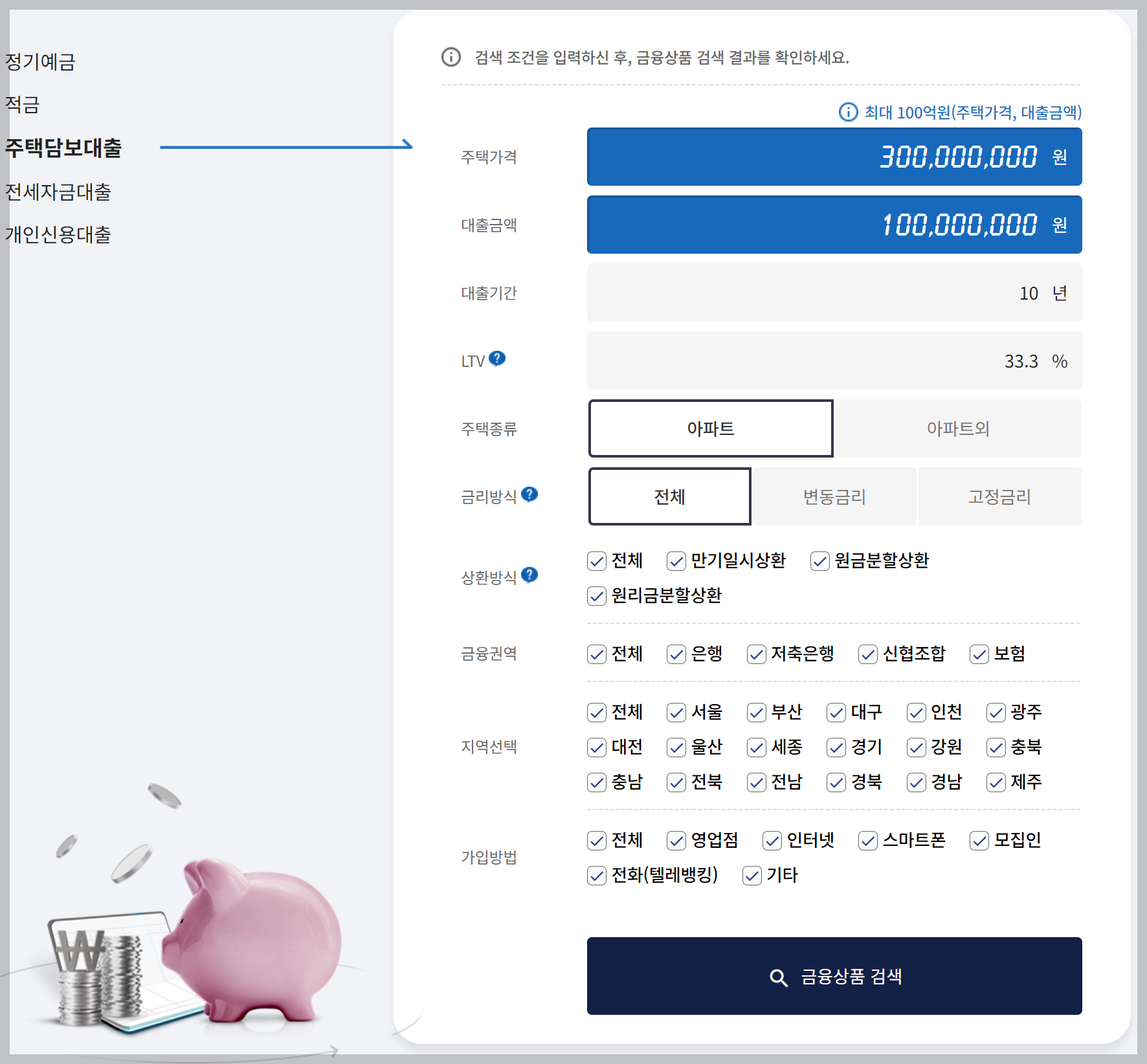 금융감독원 홈페이지를 접속하면 위와 같은 서비스를 이용할 수 있습니다. 주택담보대출, 전세자금대출, 개인신용대출 등 메뉴를 선택하고 금액과 대출기간 금리방식, 상환방식, 지역 등을 선택해서 조회할 수 있습니다.