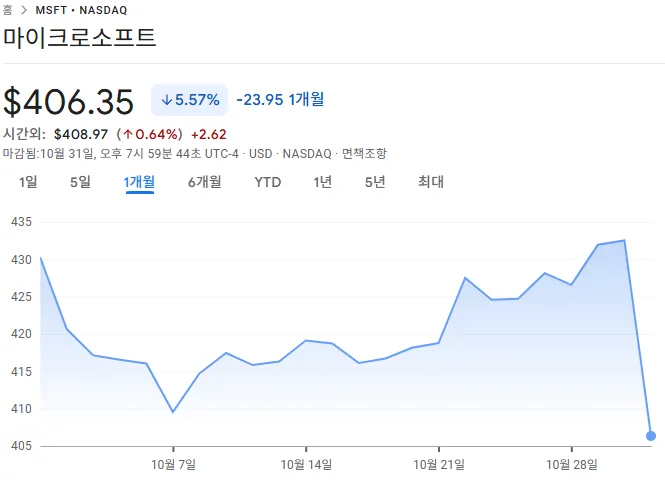 전문가들 입장에서는 AI관련 투자 증가비용이 많이 부담 스럽고, 아직 투자대비 수익을 많이 가져다주지 못하니 그렇게 긍정적이지만은 않습니다. 하지만 개인 투자자로서 바라보았을 때는 마이크로소프트는 장기적으로 큰 성장 가능성을 지니고 있습니다. 따라서 단기적인 주가 하락을 매수 기회로 활용하고 장기적인 성장 잠재력을 고려해 투자하는 전략이 유리할 수 있습니다. 다만, 현재 주가 변동성이 크기 때문에 위험 관리에 유의하면서 투자 결정을 내리는 것이 중요합니다.