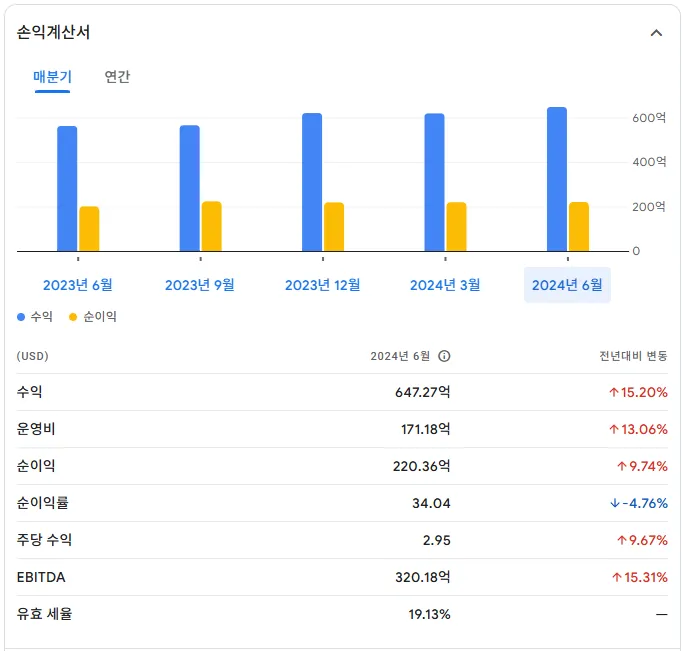 마이크로소프트(MSFT)는 2024년 10월 30일 발표한 분기 실적에서 시장 예상치를 뛰어넘는 긍정적인 성과를 보였습니다. 이번 분기 매출은 약 655억 9천만 달러로, 전문가 예상치였던 645억 7천만 달러를 웃돌며 전년 대비 16% 상승했습니다. 또한 주당 순이익(EPS)도 3.30달러로 월가 예상치인 3.08달러를 초과해 마이크로소프트가 수익성을 이어가고 있음을 확인했습니다.