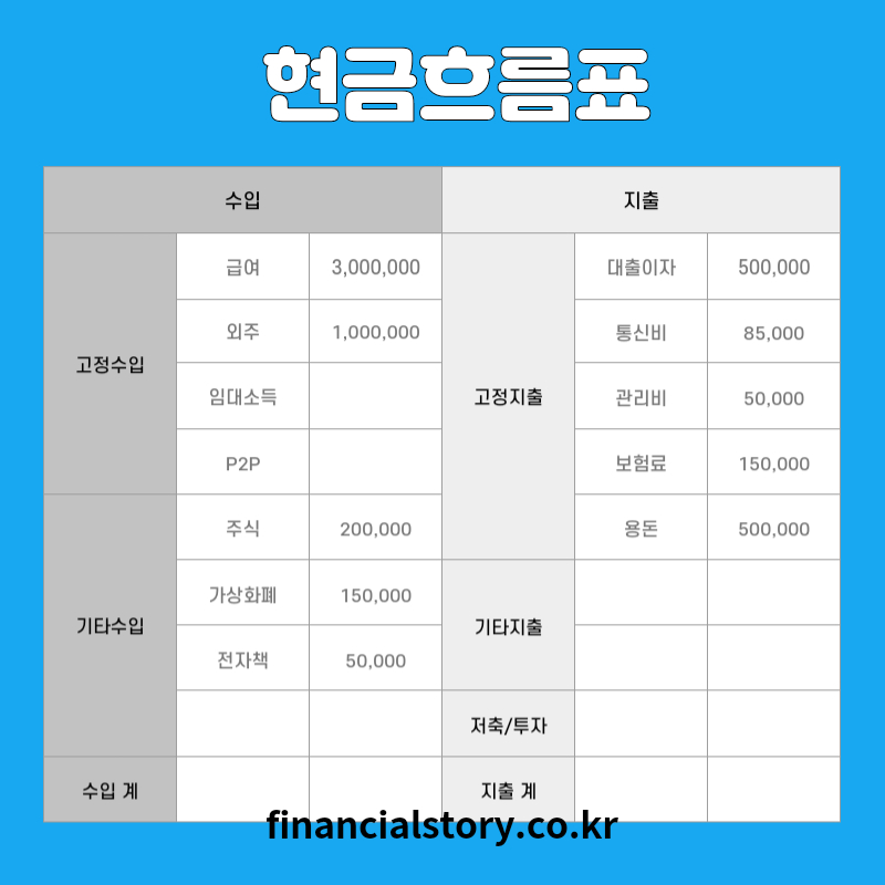 현금흐름을 확인하는데 가장 좋은 것은 현금흐름표를 작성하는 것입니다. 현금이라는 것이 실제 현금을 말하는 것이 아니라는 거 알고 계시죠? 나의 수입과 지출에 대해 한눈에 볼 수 있도록 돈의 흐름을 작성한 것을 말합니다.