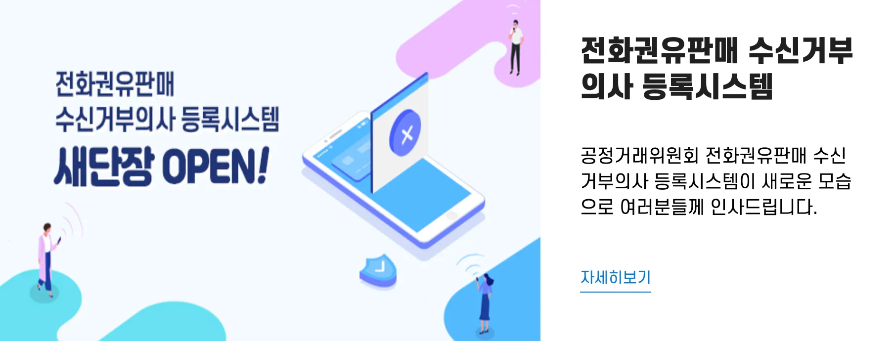 전화권유판매 수신거부의사 등록시스템 공정거래위원회 전화권유판매 수신거부의사 등록시스템이 새로운 모습으로 여러분들께 인사드립니다. 자세히보기