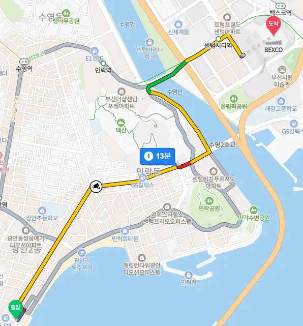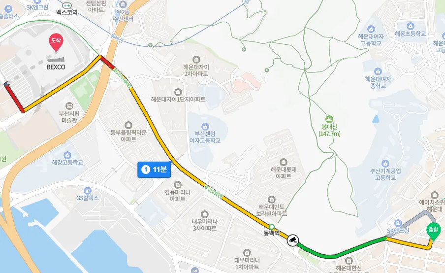 벡스코까지는 차로 13분 거리입니다. 뷰가 아주 좋습니다.
