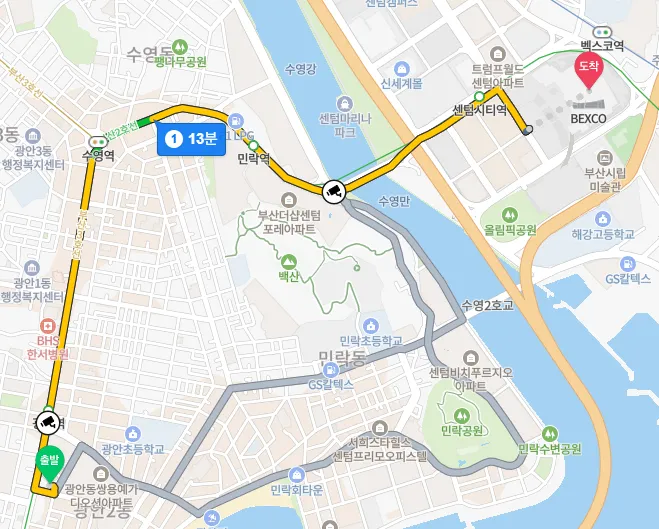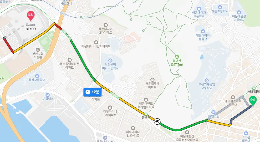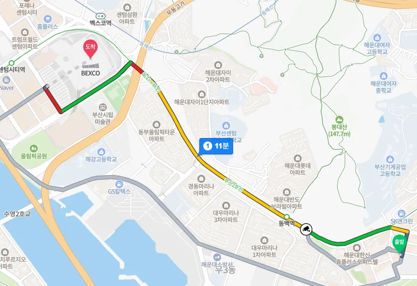 상세한 금액과 예약 가능 여부는 각각 링크에서 확인해보시면 되구요, 저는 호텔에서 벡스코까지 소요되는 시간을 정리해보았습니다.