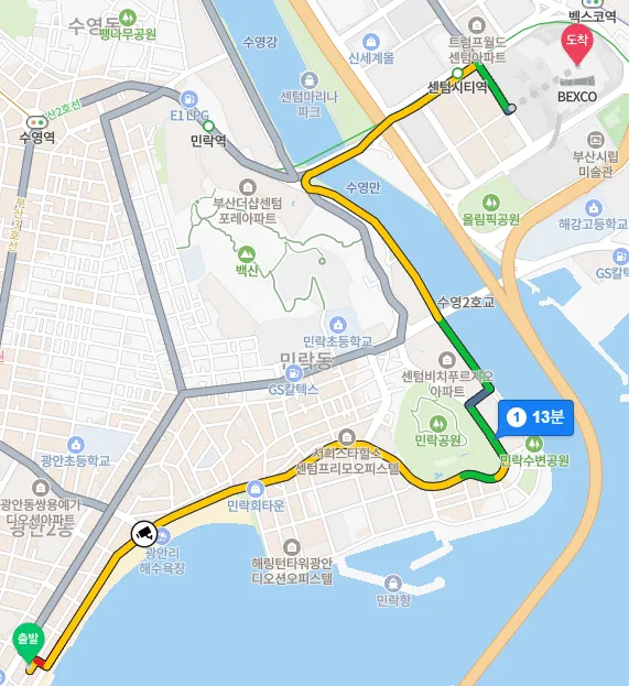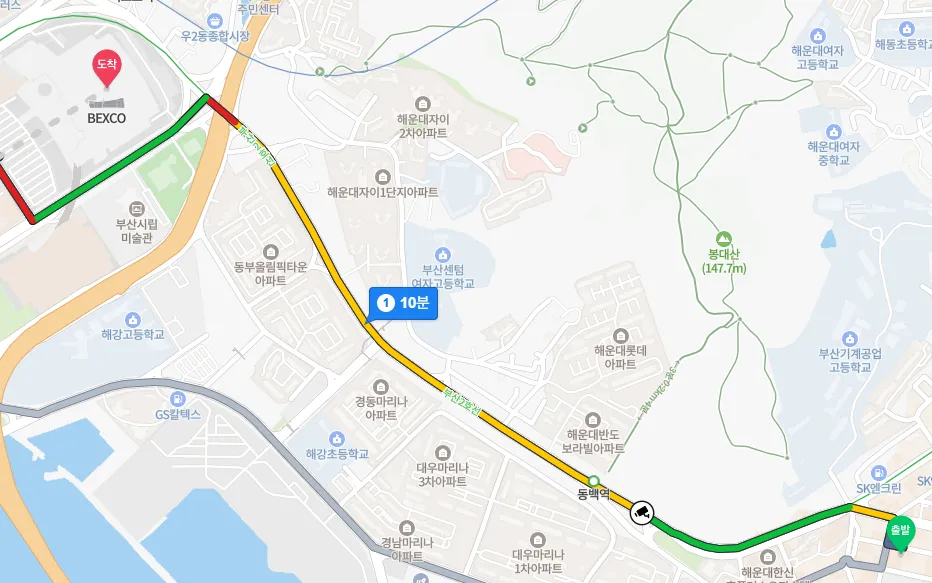 벡스코까지는 차로 13분 거리입니다. 뷰가 아주 좋습니다.