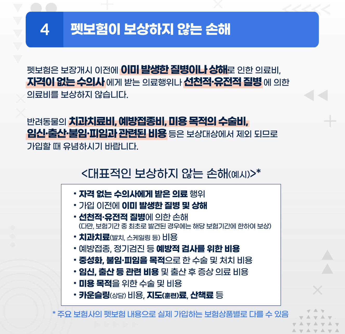 - 반려동물의 건강 상태를 보험사에 고지하지 않으면 보장받지 못할 가능성이 있으므로 주의해야 합니다.