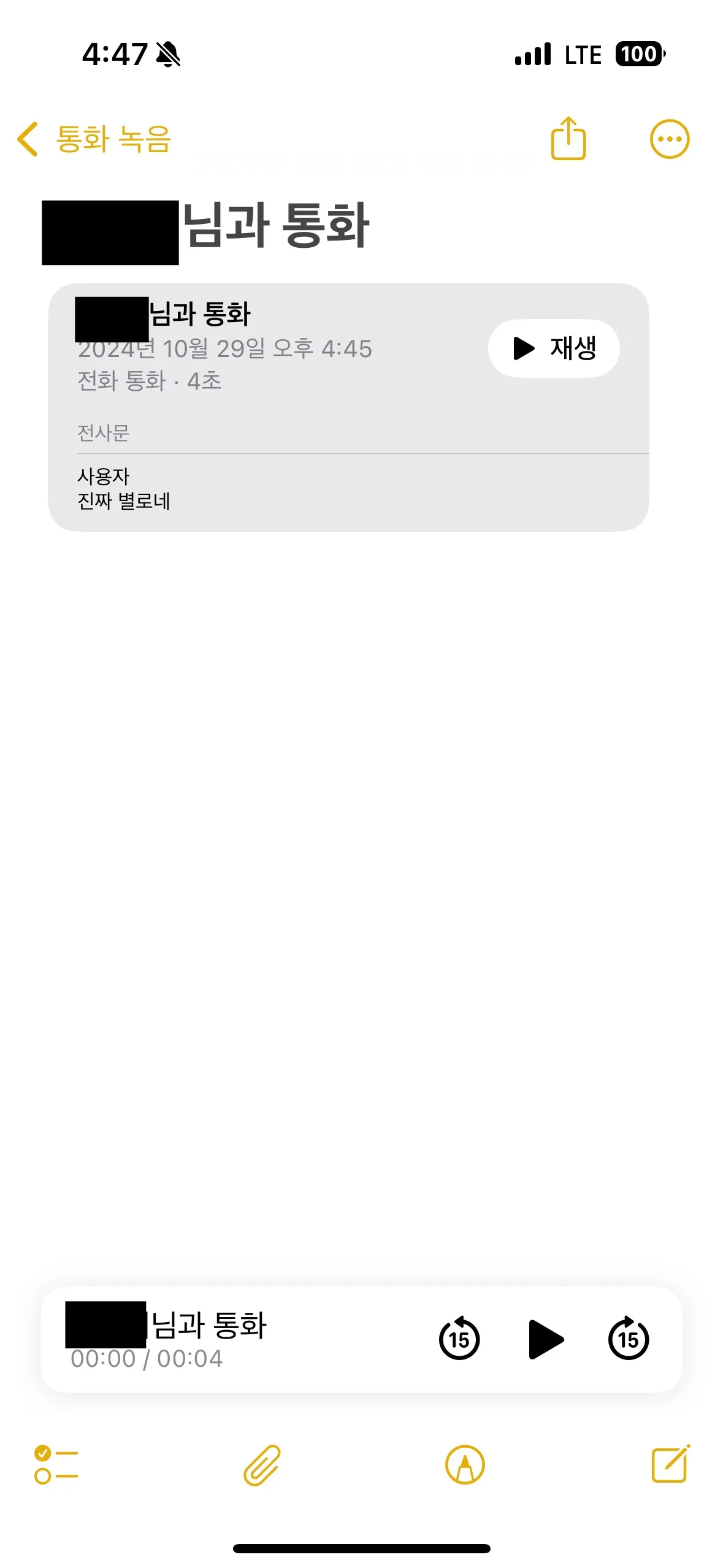 통화를 종료하고 나면 통화중에 나누었던 대화가 메모앱에 “통화녹음”이라는 폴더안에 녹음된 음성파일과 자동으로 전사한 내용이 저장됩니다. 통화 나눈 사람의 이름과 전화 통화 시간, 전사문이 기록된게 위에 보이시죠? 통화 녹음 알림을 듣자마자 제 솔직한 심정이 그대로 전사가 되어 기록된 모습입니다. 진짜 별로입니다. 녹음 알림 ㅎㅎ